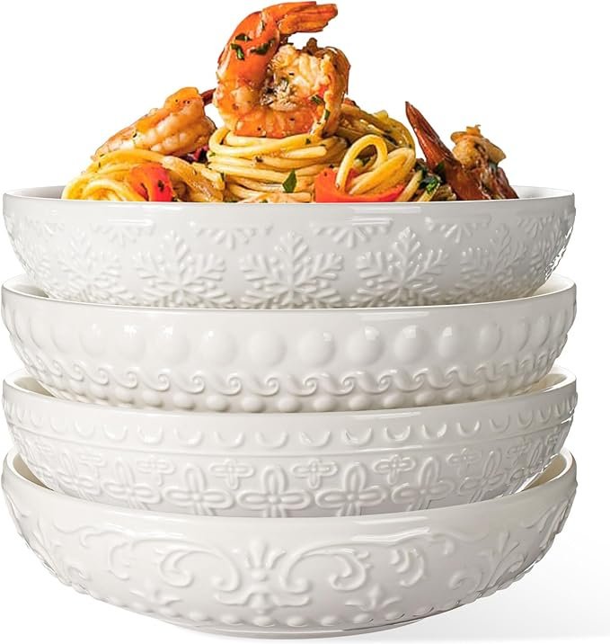 Home > Pasta Bowls, 32oz Salad Bowls Set of 4, White Ceramic Soup Bowls 8 Inch Embossment Large Serving Bowl Wide and Shallow Bowls for Kitchen
