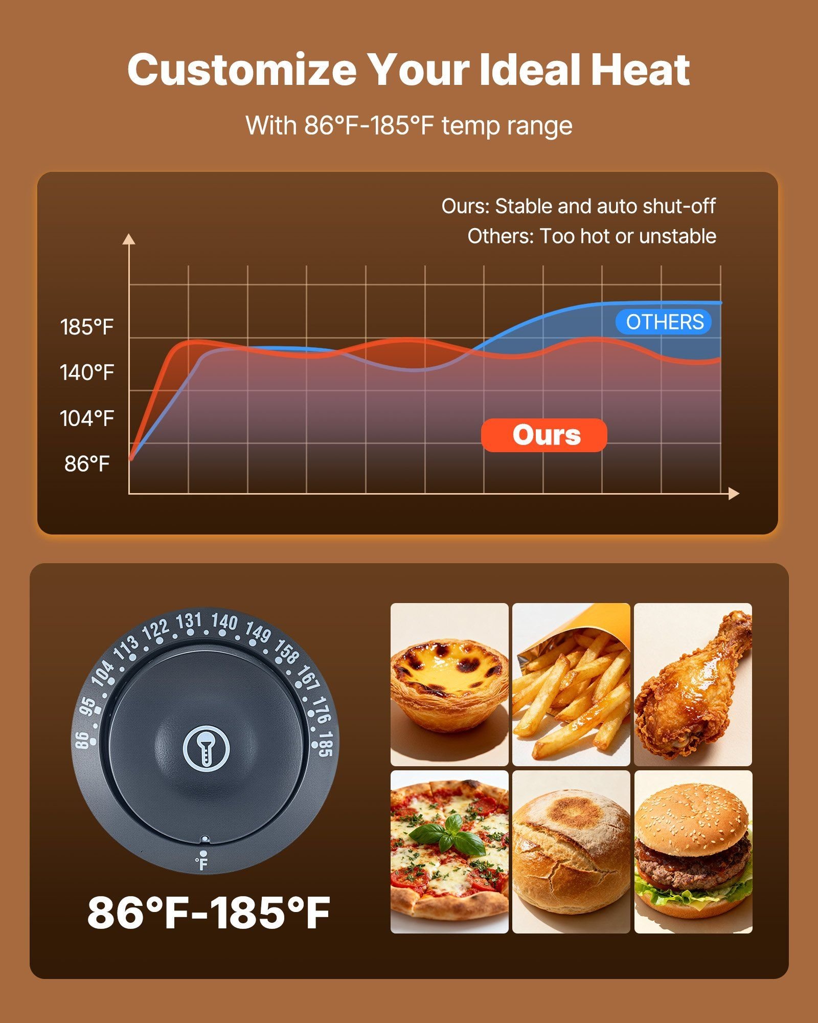 1.Consistent Temperature: This food warmer display maintains food at a steady temperature, making it ready to serve anytime. It features an easy-to-use knob with an adjustable 86–185 Fahrenheit (30–85 Celsius ) range to suit different foods