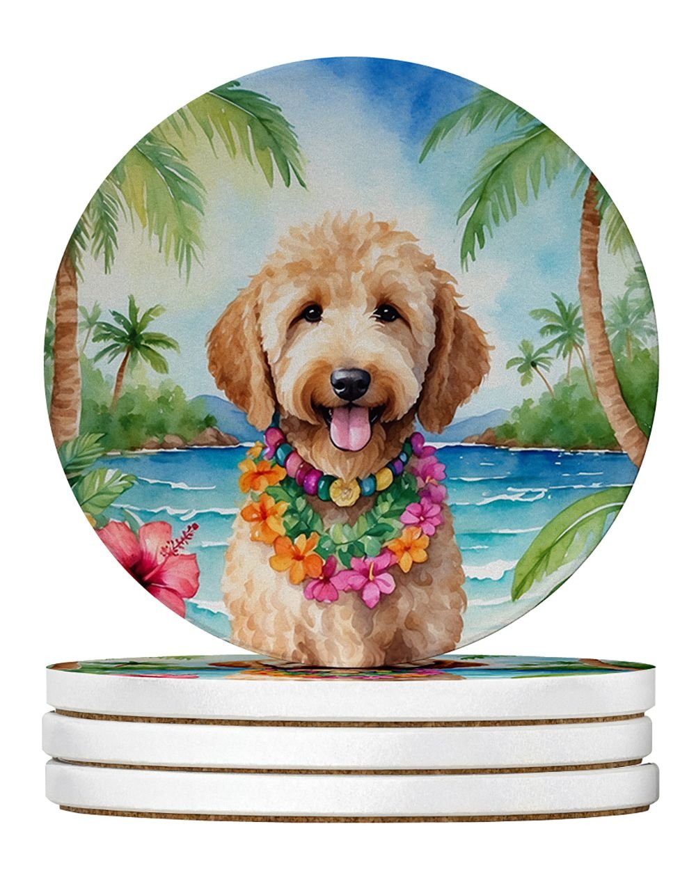 Home > Goldendoodle Luau Large Sandstone Coasters Pack of 4 Absorbent Round Coasters Decor Gifts for Men or Women, 4 in, Multicolor
