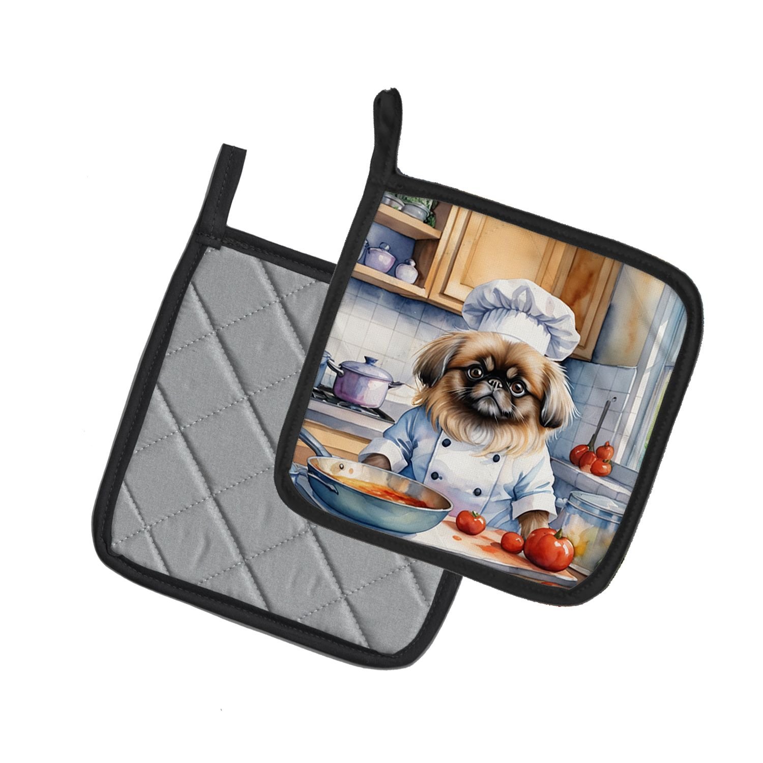 Pair of Pot Holders featuring breed specific Pekingese artwork. A Pair of Pot Holders to match your kitchen decor. Made in the USA these are thick and functional. Full color artwork decorates the front polyester fabric of the hot pad and accented by a black trim. Use these at as a trivet for your Thanksgiving or Christmas tablescape. Filled with insulated fabric and quilted for durability. These colorful pot holders will make a great gift for your favorite home cook or executive chef. Each pot holder measures approximately 7 1/2 inches by 7 1/2 inches. A hanging tab is included.