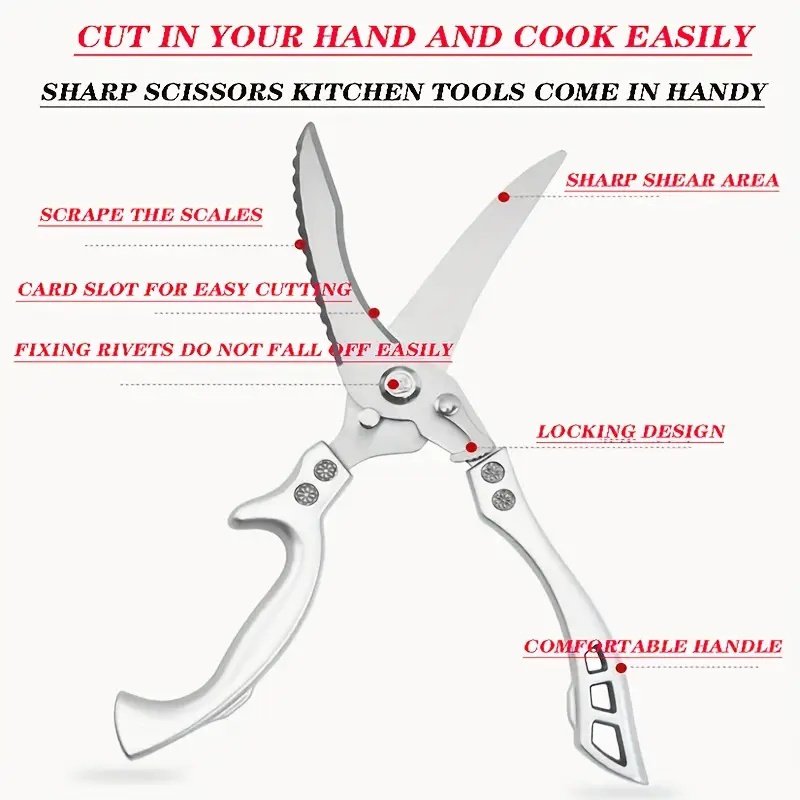 German industrial grade stainless steel kitchen scissors designed specifically for modern kitchens, forged with high carbon stainless steel, featuring automatic rebound function and detachable design, making them the perfect tool for chefs, home chefs, and culinary enthusiasts to easily handle chicken, fish, meat, fruits, and vegetables!